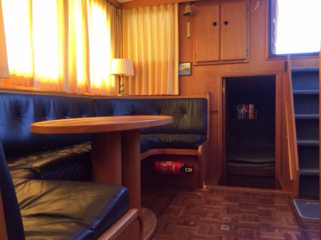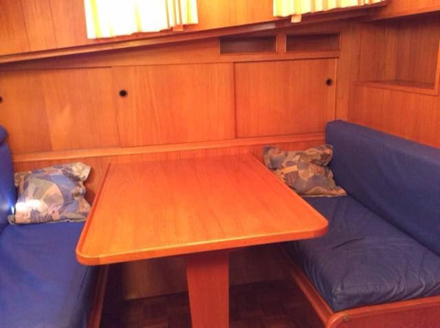 Saloon with banquette seating in U with dark blue leather cushions. Wooden table not fixed, storage areas. Interior helm position with helm seat and sliding door to port side, Radio CD Sony