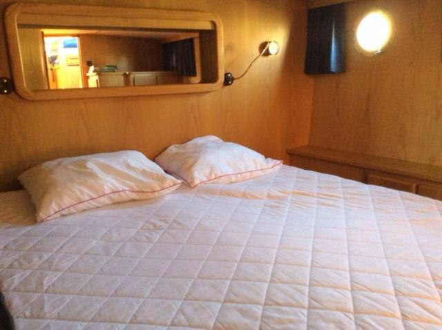 Rear cabin with big double berth, cupboards and wardrobe, safe, bathroom with basin, electric wc and good size shower