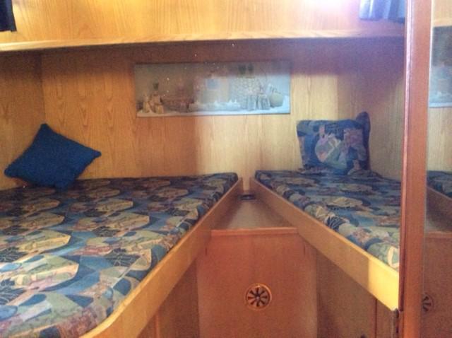 Forward cabin with 3 berths – 1 double and 1 single, cupboards and wardrobe, bathroom with basin, manuel wc and shower.