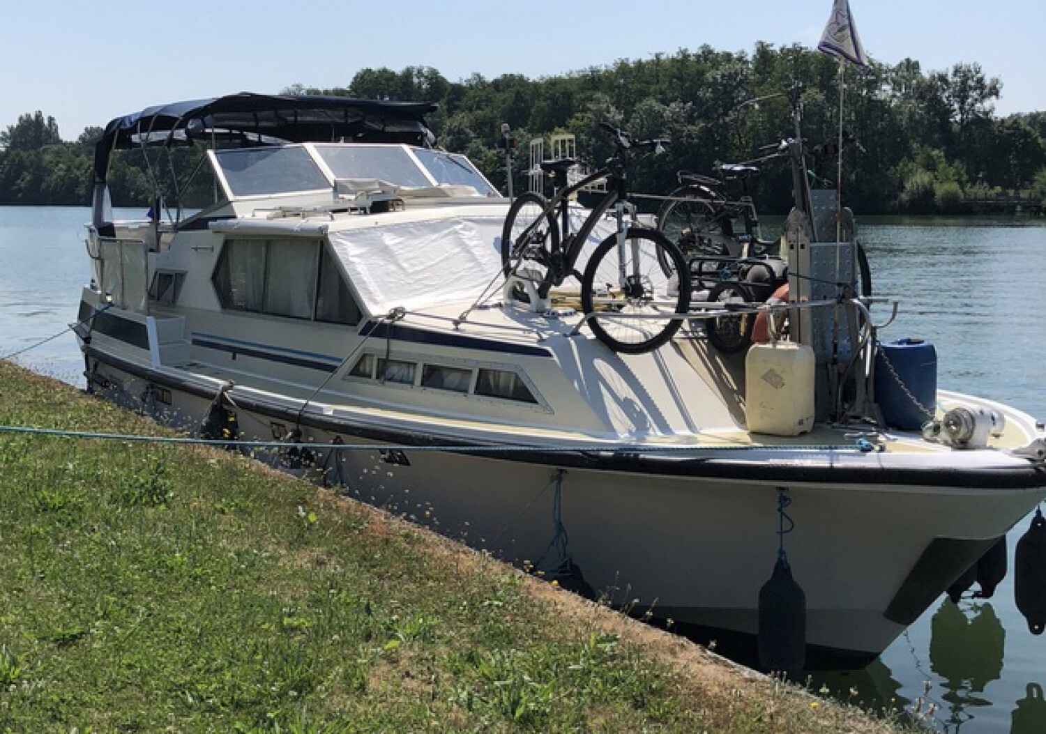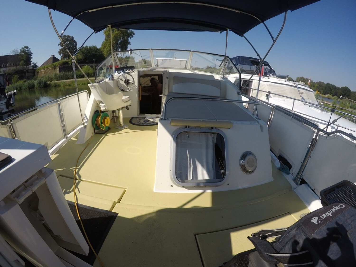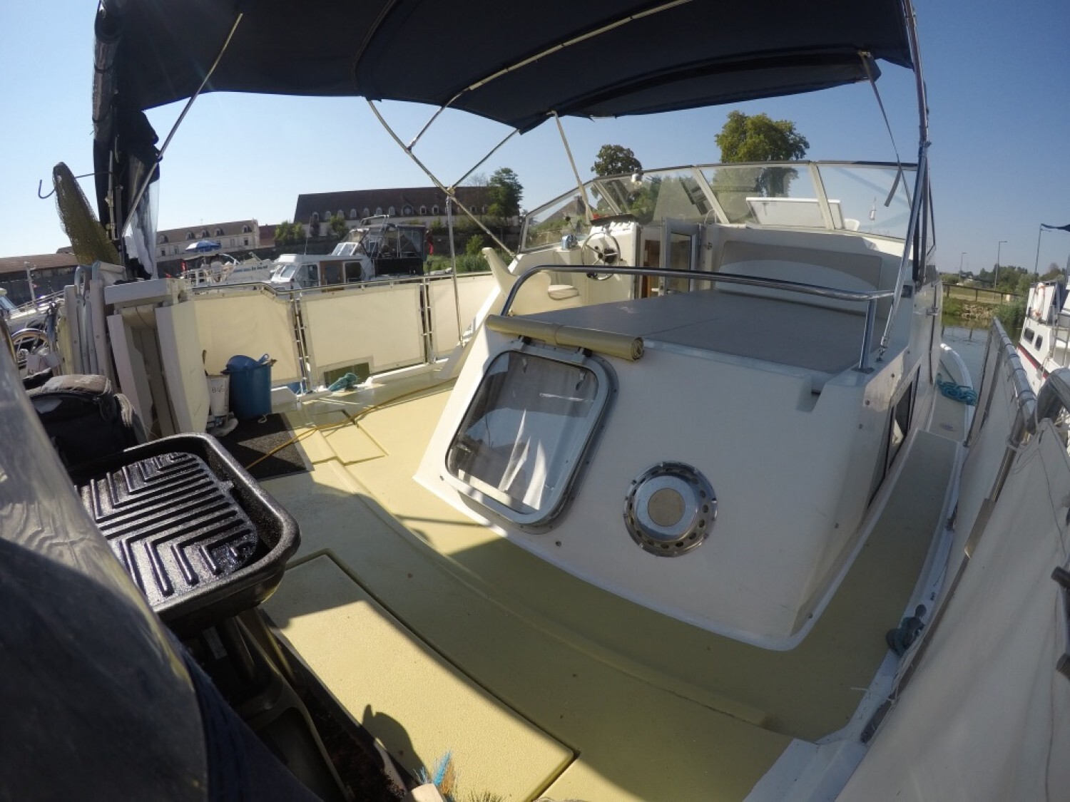 Features include: 2 cabins, 2 bathrooms, convertible sofa in the saloon; plenty of storage; heating system and hot water tank; 12V and 220V electrical circuits with socket for shore power, solar panel; cooker with oven, refrigerator; CD player and TV; electric bilge pump; black water tank; swim ladder; bimini and awning