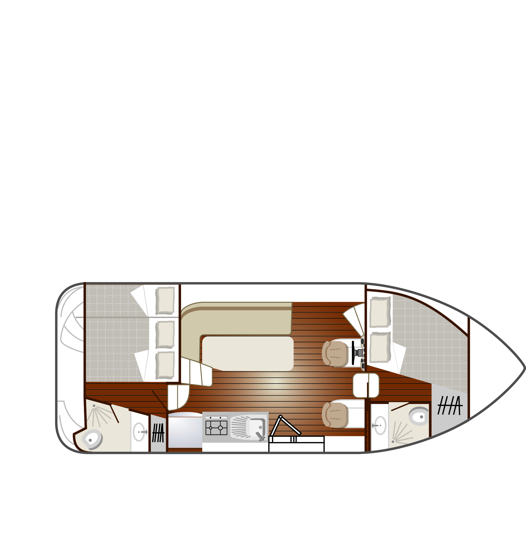 The Confort 900 centre-saloon boat provides space and luxury for 4+ people. Both double cabins (at either end of the boat) – one with an extra single bed – have en-suite shower-rooms. The saloon sofa also converts into a double bed.