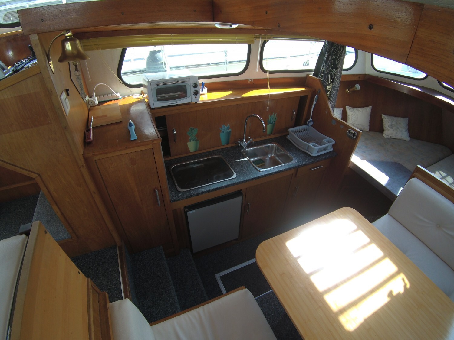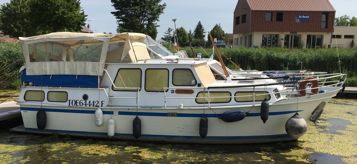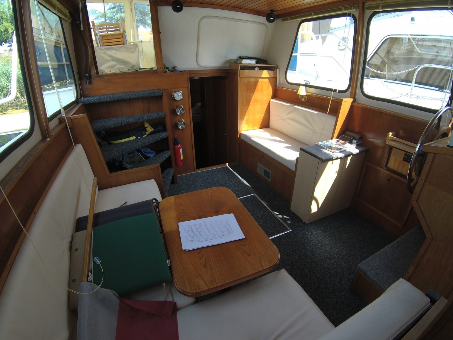 Features include: 2 cabins, 1 bathroom, convertible sofa in the saloon; plenty of storage; heating system and hot water tank; 12V and 220V electrical circuits with socket for shore power; cooker, refrigerator; CD player; electric bilge pump, bow and stern thrusters