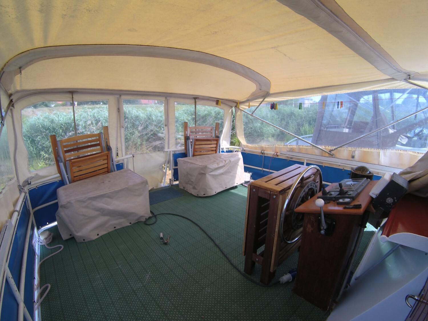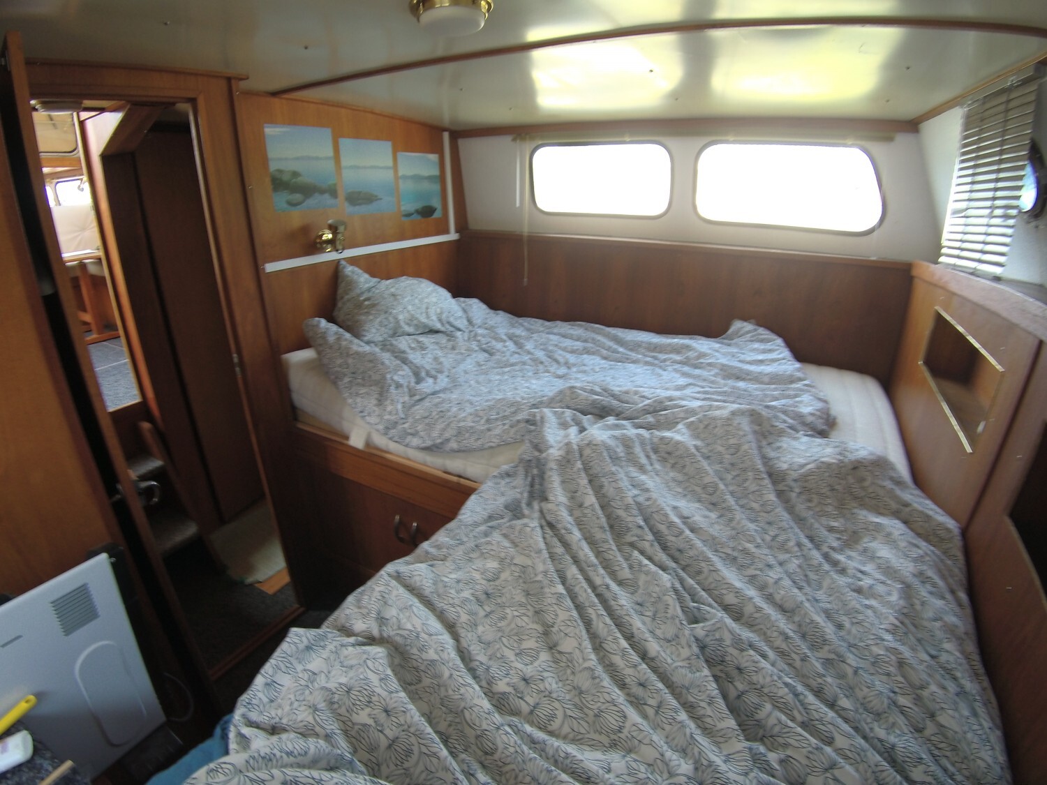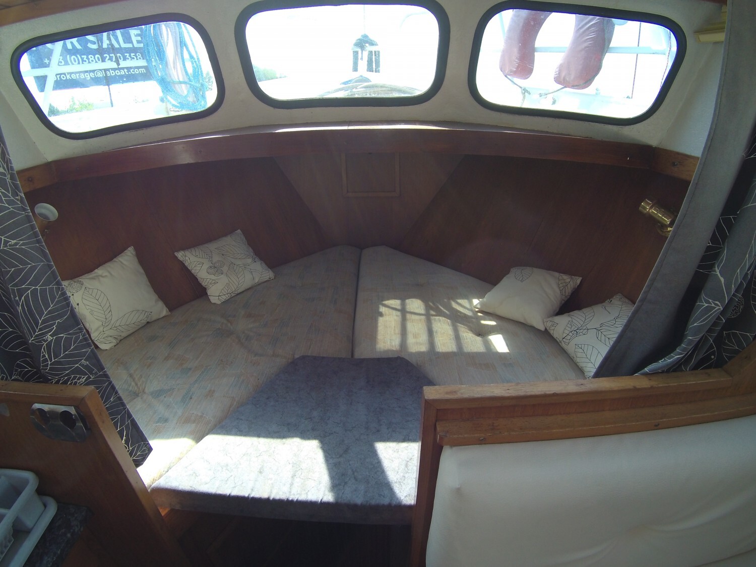 Features include: 2 cabins, 1 bathroom, convertible sofa in the saloon; plenty of storage; heating system and hot water tank; 12V and 220V electrical circuits with socket for shore power; cooker, refrigerator; CD player; electric bilge pump, bow and stern thrusters