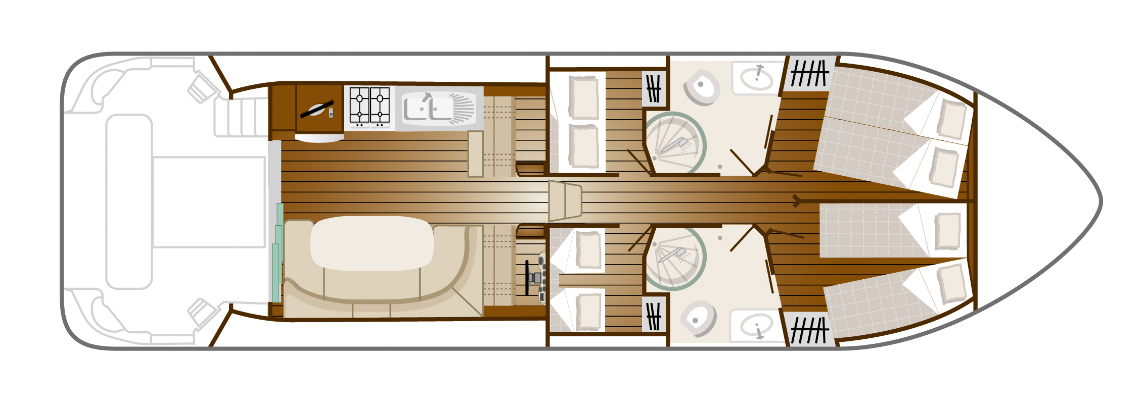 The Nicol’s OCTO, part of the new “Estivale” generation, was designed in 2009. With its 4 cabins (with convertible beds: double bed or twin beds) it is ideal for 4 couples, or 2 couples and 4 children. It has the same aft terrace, level with the living quarters (access via a large sliding bay window), previously seen and admired in the Sedan range.