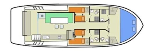 - 2 compact cabins with twin beds and en-suite bathrooms.