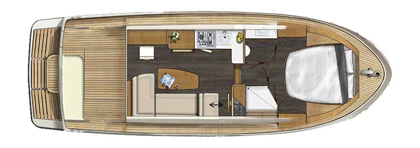 The 30SL SE Sedan provides a single, two-person cabin, plus the saloon settee converts ingeniously into a double bed. The spacious and bright saloon has level access aft through to the rear sun deck. See also the 30SL AC Aft Cabin variant.