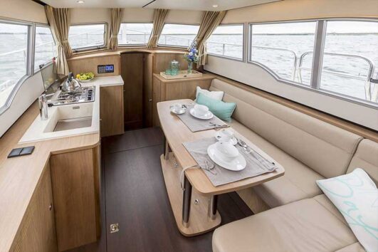 AC Aft Cabin and SE Sedan Linssen motor yacht types are equipped with the EASY SLEEP CONVERT SYSTEM. This system enables you to convert the saloon settee seat into a full-size double bed in no time at all. By simply removing the saloon table and cushions, you can pull the settee out, and a slatted base appears automatically. Replace the cushions again to create a comfortable bed for two people.