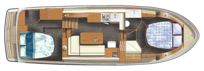 The AC version of the Grand Sturdy 35.0 has a fore and aft cabin with a double bed. Four people can sleep comfortably on board. The fore cabin has a toilet, a separate shower and various cupboards. The aft cabin has a spacious cupboard on the port side. In addition, in both AC and the Sedan models, the Easy Sleep Convert System makes it possible to create two extra sleeping berths by converting the saloon settee into a double bed.