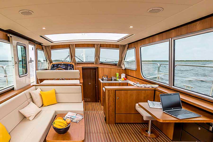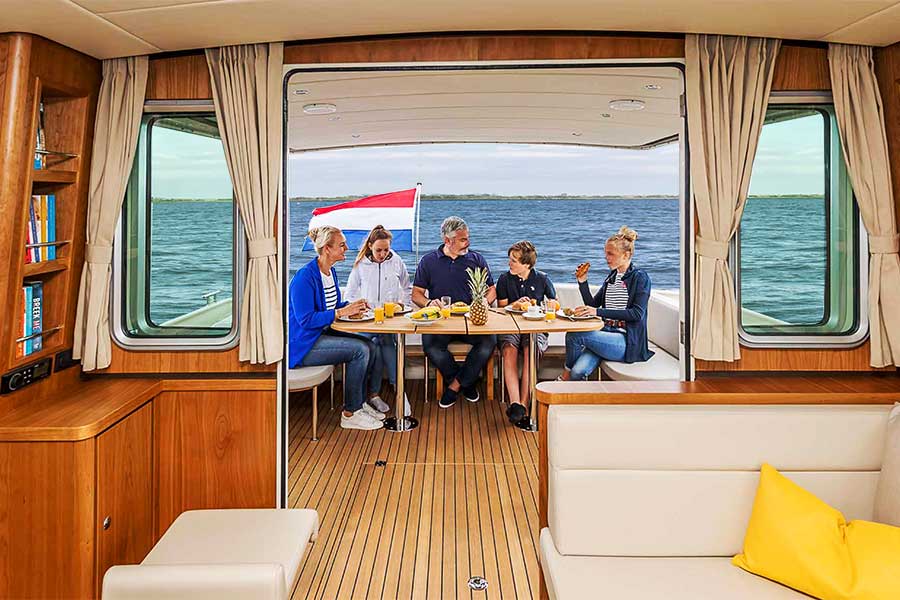 The integrated settee bench in the spacious open aft deck is an enjoyable place to sit. The standard extended saloon roof offers you protection against less favourable weather or shelter from the blazing sun.