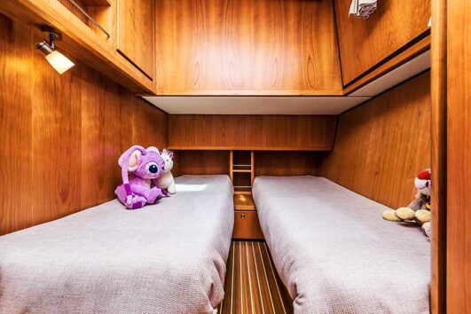 The spacious forward cabin is the owners’ domain. It has a large and comfortable double bed and enough surrounding space to move, cupboards and storage areas for clothes and other possessions. There is a separate toilet on the starboard side and a shower on the port side. There is a guest cabin amidships with two single beds. Guests use their own toilet/shower in the passage on the starboard side.