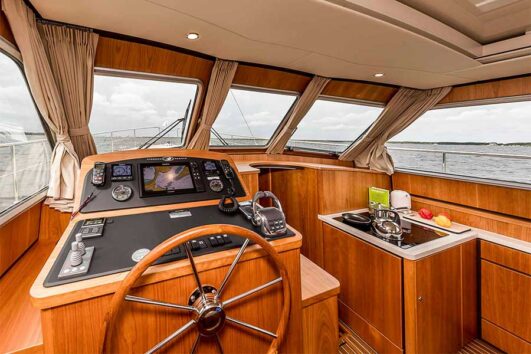 With the added luxury of the Linssen Variodeck® opening sun-roof, you will really feel as if you are on a much bigger boat. You can enjoy bracing fresh air and the invigorating rays of the sun whenever you want. It only takes a moment to operate the Linssen Variodeck®, which is light as a feather to move. Just choose one of the five fixed positions to combine the wheelhouse and cockpit into a spacious “outdoor deck”. And that’s without having to sacrifice any aspect of on-board comfort and protection.