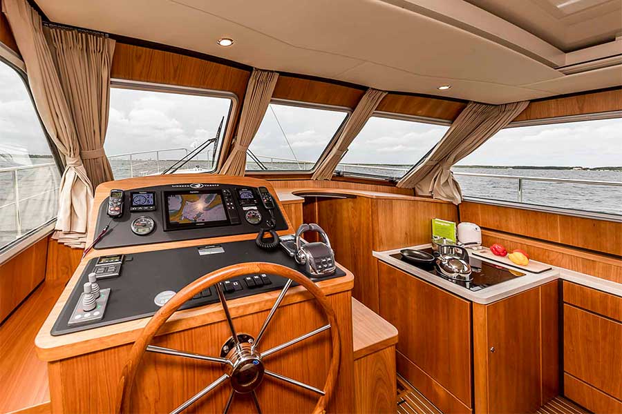 SE Sedan versions of Linssen motor yachts are, in particular, very popular because of the impressive amount of living space created by merging the saloon and the open aft deck (protected underneath the extended saloon roof line). And all that on one level and – apart from the low threshold – without having to go up a single step.