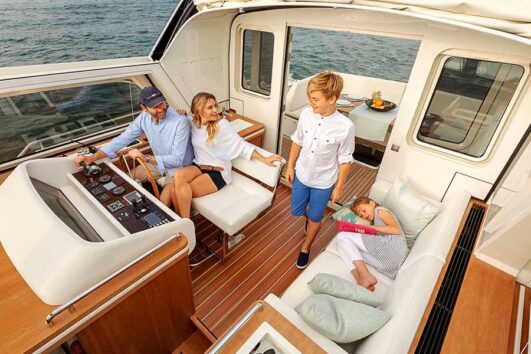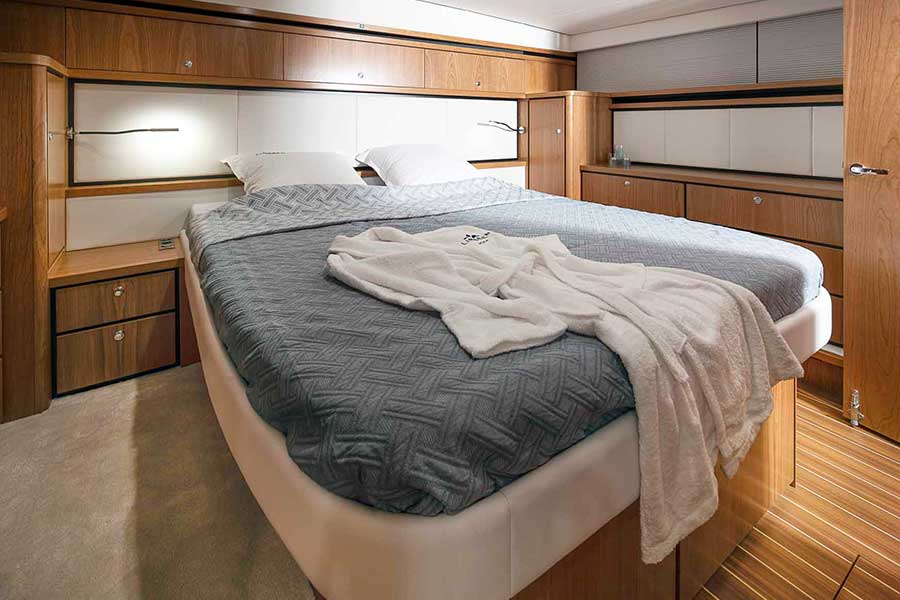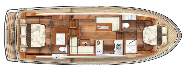 All three have an AC Aft Cabin configuration, the 450 AC having two bedroom cabins – a spacious master bedroom suite and a similarly ample guest bedroom suite. The two-cabins-only arrangement means that all areas of the motor yacht are very generously sized, with plenty of room to relax and enjoy.