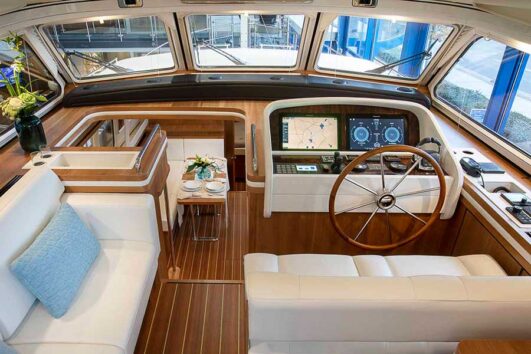 The Variotop is a folding roof that covers the wheelhouse so that it is completely watertight and insulated thanks to ingenious locking and sealing systems. Close the Variotop and the wheelhouse doors and the open helmsman’s position is instantly transformed into a heated Variotop wheelhouse where it is a pleasure to be. On a warm summer’s day, just cruising along, the boat gently rolling at anchor or leisurely moored to the quay, the Variotop – now like a fully fledged bimini top – provides wonderful cool shade.