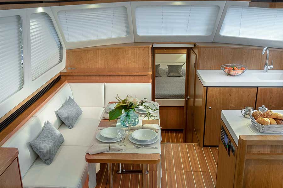 Styling, equipment, choice of materials and finishing are all of Linssen level, as is customary and just as you would expect. Linssen makes no concessions when it comes to quality. You can see that in the saloon with the saloon bench and table, in the spacious galley with all equipment you will need and in the L-dinette with functional dining table for breakfast, lunch or dinner.