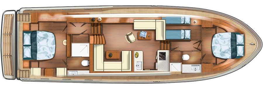 All three have an AC Aft Cabin configuration, the 500 AC having three bedroom cabins – a spacious master bedroom suite and a similarly ample guest bedroom suite, plus a twin-bedded side cabin. The overall size of the 500 AC means that, even with a three cabin layout, all areas of the motor yacht are very generously sized, with plenty of room to relax and enjoy.