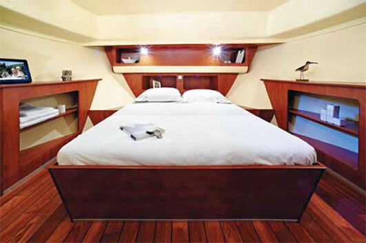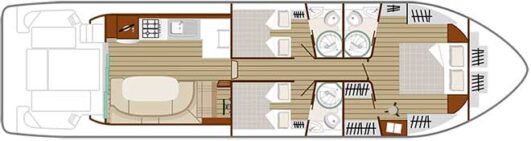 The Nicols Sixto Fly boat has 3 cabins for 6 persons, with a smart modern design for master and twin-bed cabins, an excellent shower-room and a spacious bright panoramic saloon and galley area. There is also a sofa-bed in the saloon.