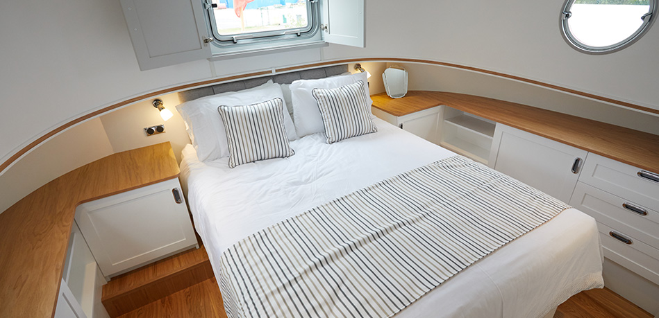 King size bed to bow cabin with ensuite and walk in shower (if chosen)