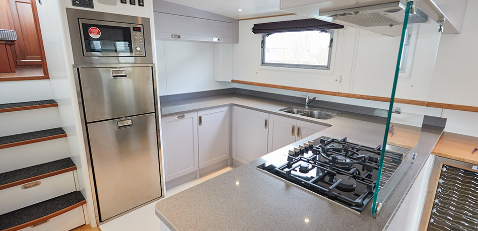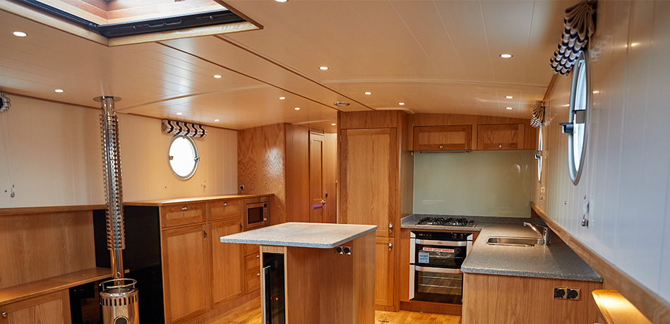 Open plan saloon and galley with refleks stove