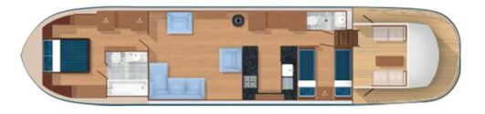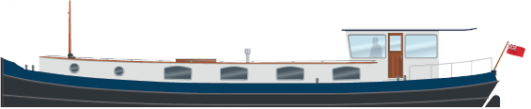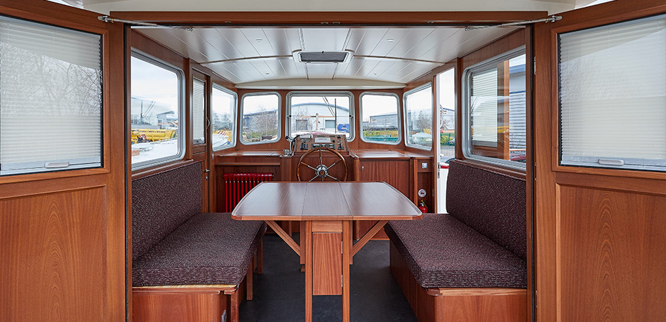 The stern deck and the wheelhouse are both the same size as for the 49M Motor Class Dutch barge, so that the additional length provides a roomy saloon and galley area.