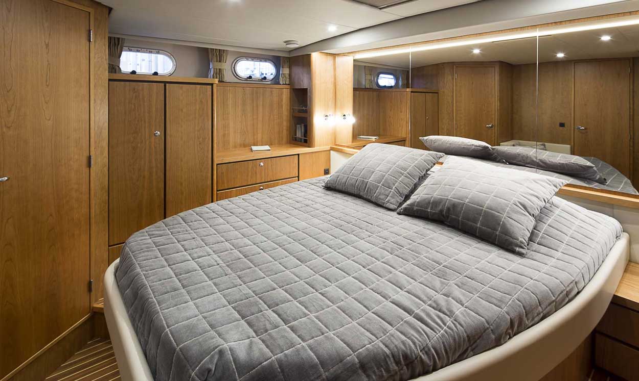 The aft cabin itself, also a few steps lower and extremely spacious, has a double bed and toilet/shower. Above the cabin is the raised aft deck, with a secure folding roof as standard, offering protection to the upper helm position. The aft sun deck is perfect for enjoying the passing scene and for entertaining.