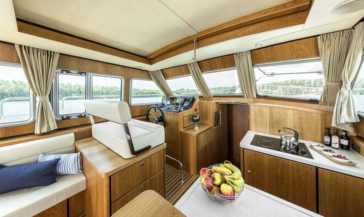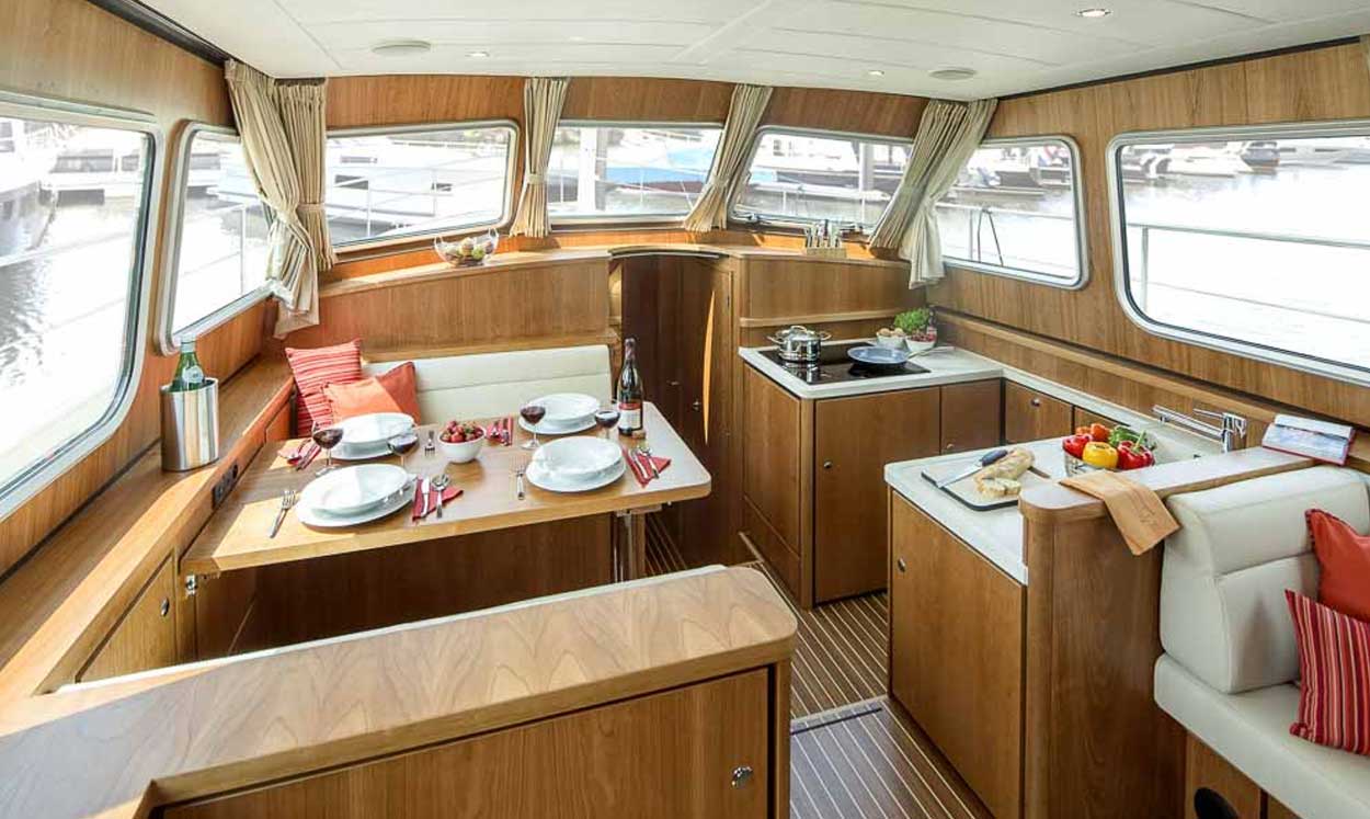 Linssen SE Sedan layout boats have a large main cabin that includes the inside helm (steering position), the galley (kitchen) and the boat’s saloon (sitting and dining area). The accommodation areas – forward double cabin, shower and toilet – are a few steps lower than this living space and the saloon seating also converts into a proper double bed.